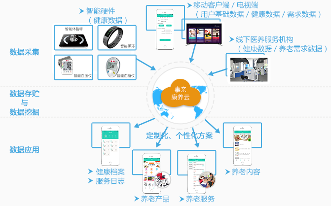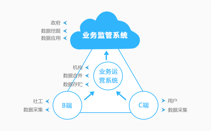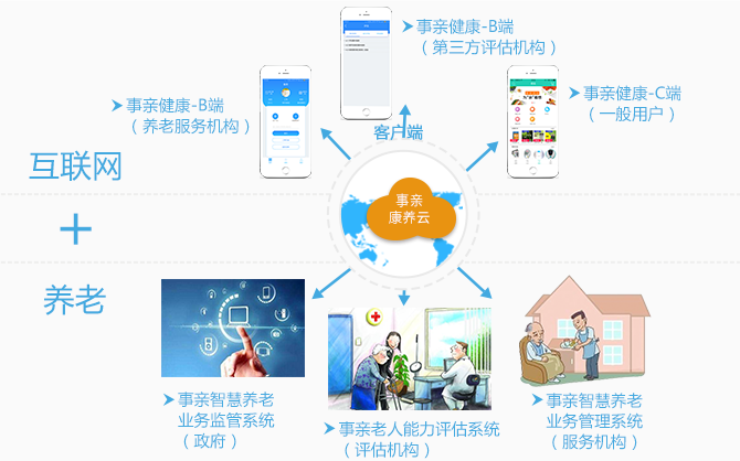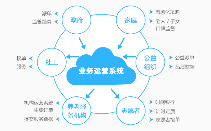 为政府、养老机构、服务中心低成本使用智慧养老平台提供云端技术支撑;为政府、养老机构、服务中心提供互联网运营支持。