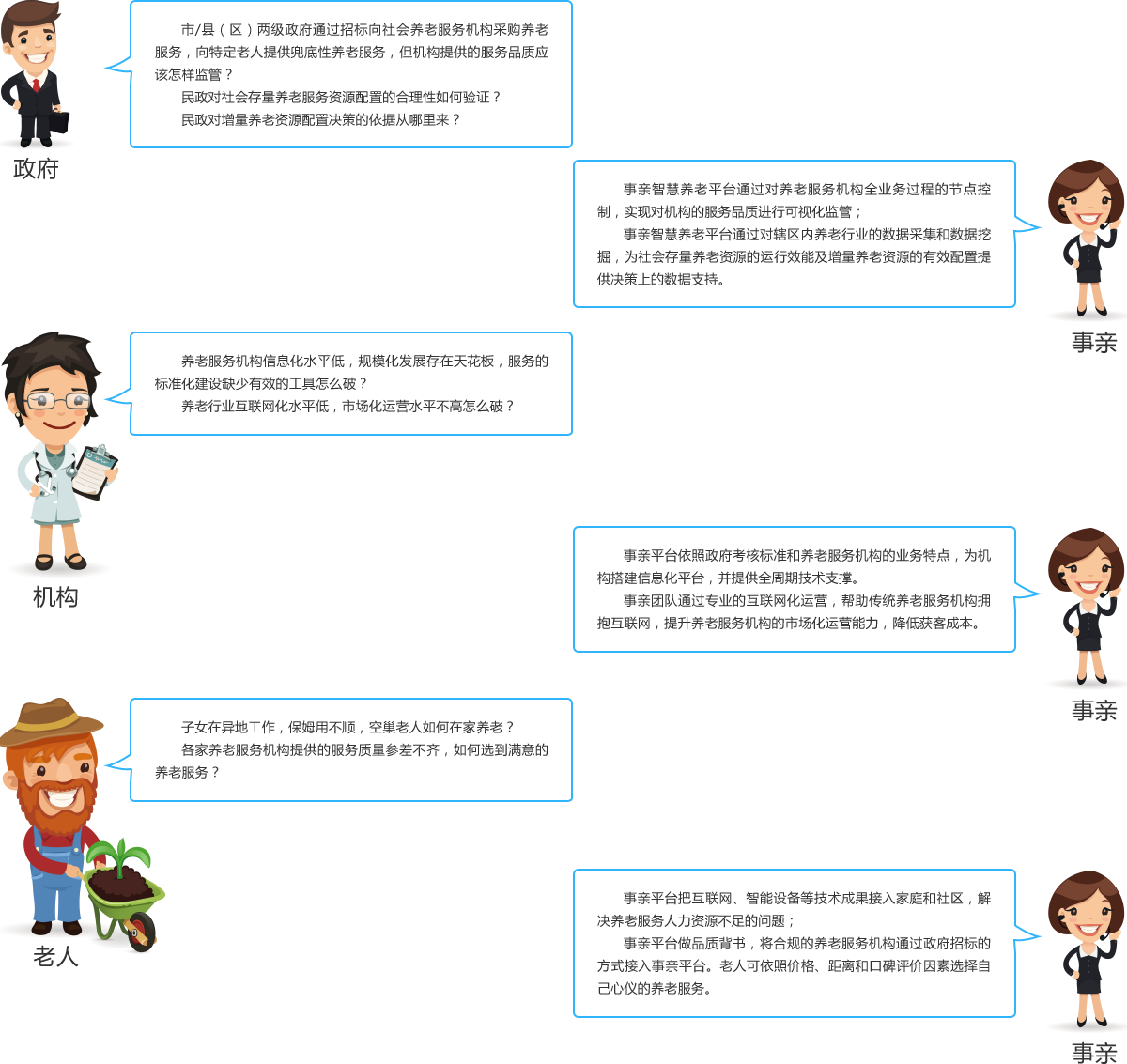 通过互联网+物联网的技术手段,结局居家养老服务劳动力不足的难题;通过养老服务标准化建设,解决居家养老服务不规范的问题;一站式解决老人及家人对养老服务、养老产品及养老内容的需求。